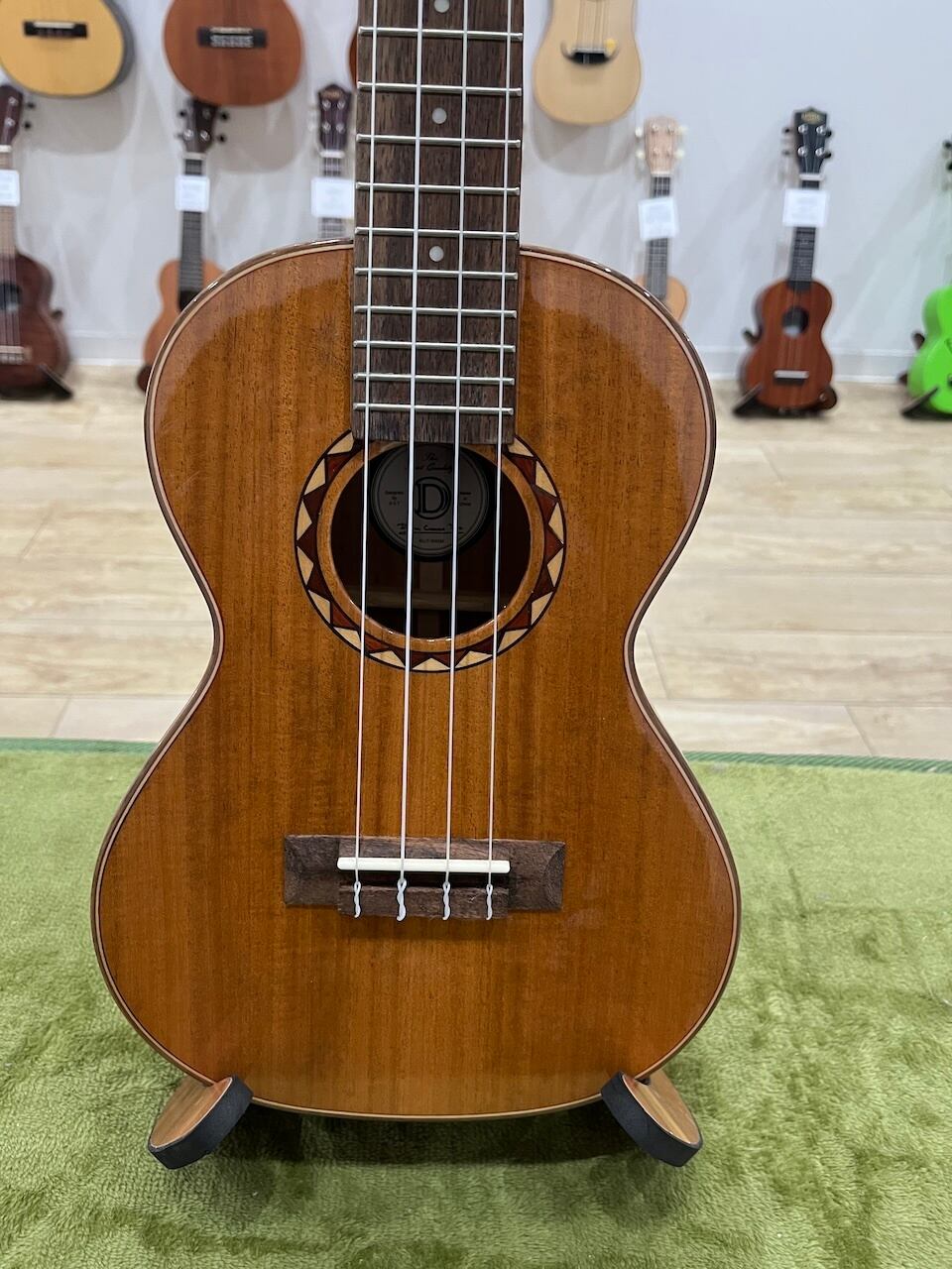 このモデルは表板、裏板にはマホガニーの単板を用いています。音を形作る重要な材料を単板にしているため、オール単板に限りなく近いくっきりとした演達性のある音が生まれます。また、ロゼッタにはメイプルと花梨を用いたウッドロゼッタ。音色、見た目共に美しいウクレレに仕上がっています。
