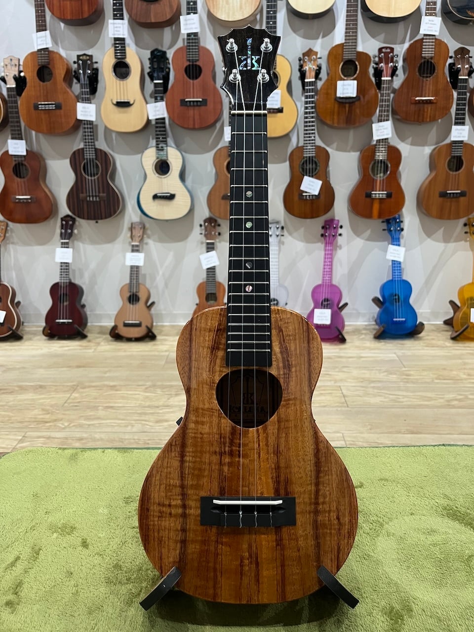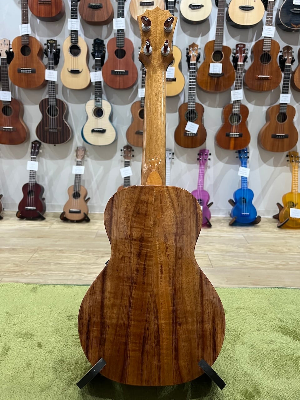 その最大の特徴は圧倒的な鳴りやすさにあります。カマカは時間が経ってから鳴り始めると言われていますが、コアロハは対照的に出来た時から鳴っているウクレレと言えるでしょう。その理由としてその軽さにあると思いいます。ボディ材は厚みを薄くしてより振動しやすくし、ライニングと言われる横板と表板と裏板の糊代に当たる部材を独自の工夫により無くし軽量化を施しています。また、このモデルはヘッドにUPTという日本の後藤ガット社が製作する軽量のプラネタリーチューナーが搭載されているので、一層の軽量化が実現されています。